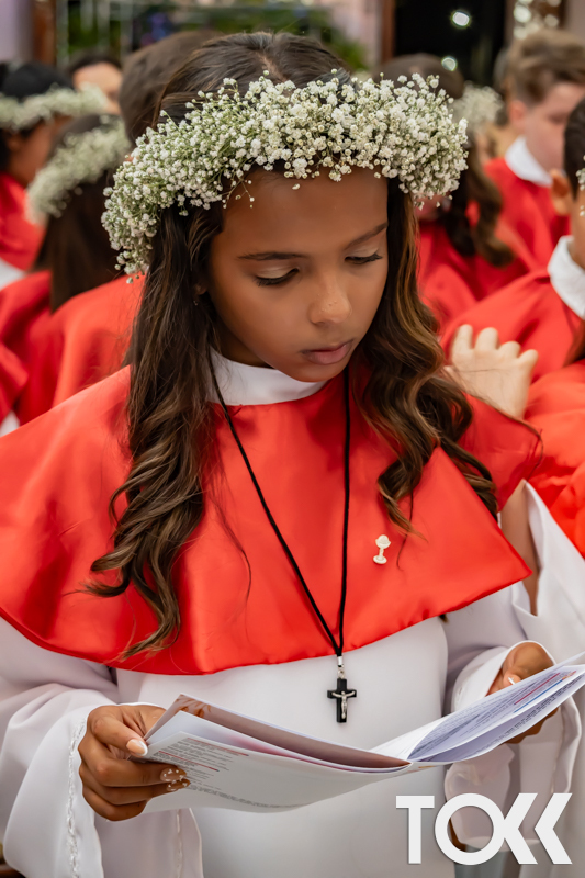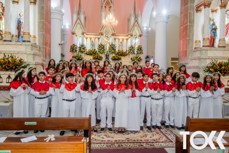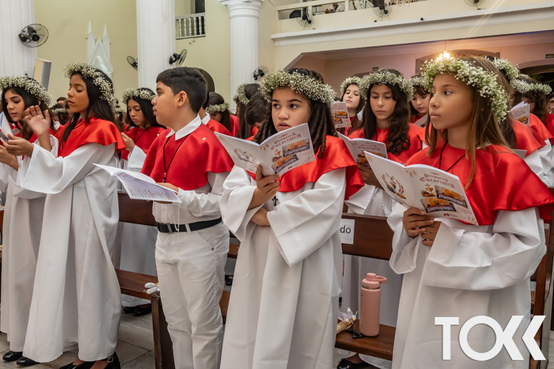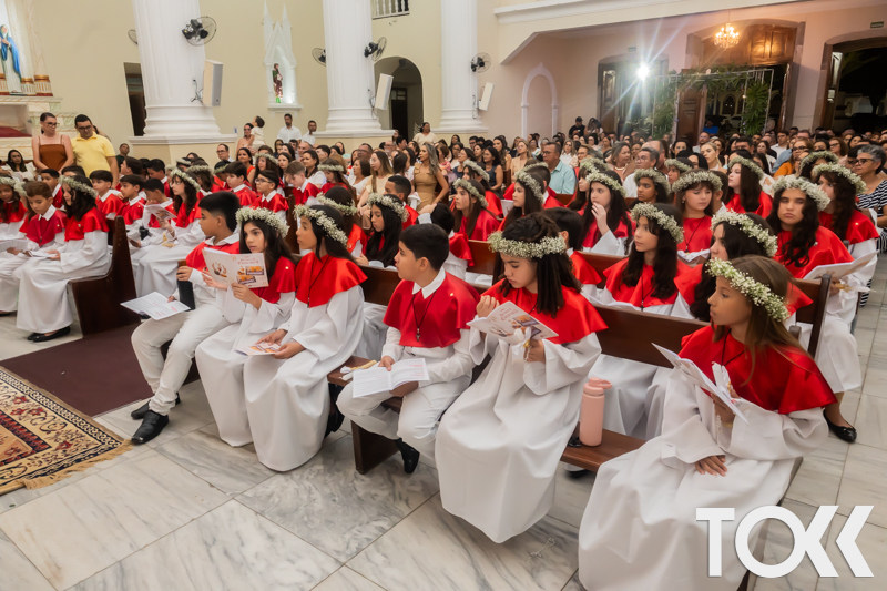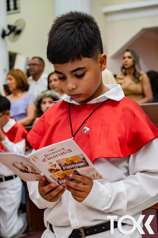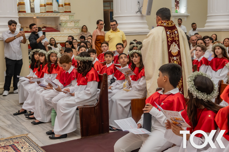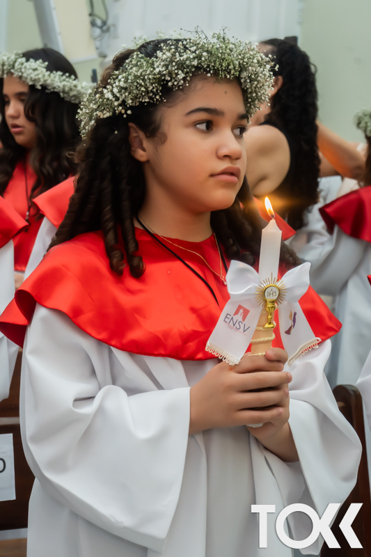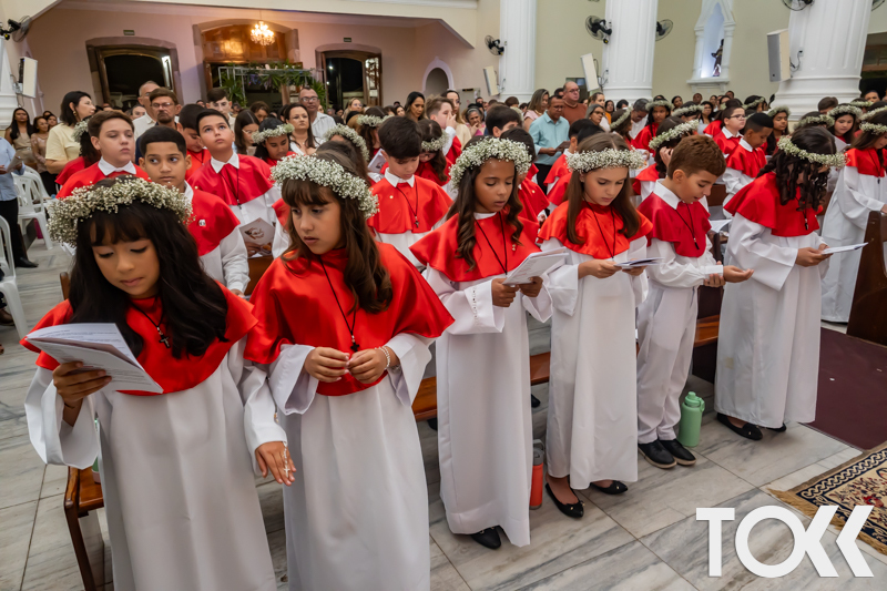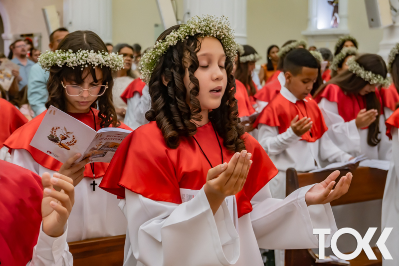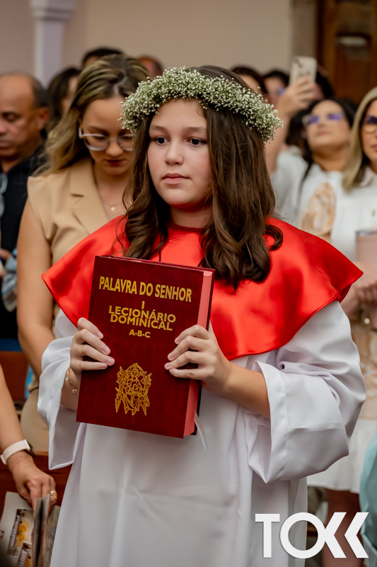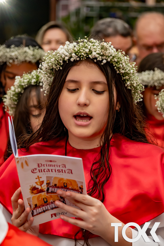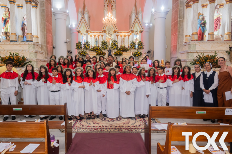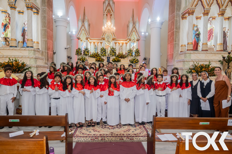 “Neste sábado, dia 22 de novembro de 2025, a Igreja Matriz São João Batista foi palco de uma celebração especial: a primeira eucaristia dos estudantes do Educandário Nossa Senhora das Vitórias(ENSV) . Com alegria e fé, os jovens receberam Jesus pela primeira vez na sagrada comunhão. A cerimônia foi marcada pela presença de familiares, amigos e professores, que acompanharam de perto essa importante etapa na vida espiritual dos estudantes. A missa foi celebrada com música, orações e reflexões que destacaram a importância da fé e do amor de Deus em nossas vidas. Nessa ocasião, os estudantes renovaram suas promessas batismais e receberam a hóstia consagrada, simbolizando a união com Cristo. Foi um momento de grande emoção e gratidão para todos os presentes. Parabéns aos estudantes da escola Educandário Nossa Senhora das Vitórias por essa conquista espiritual! Que essa primeira eucaristia seja o início de uma jornada de fé e amor a Deus.” Fotos para www.tokk.com.br foram cedidas gentilmente por Carlos Eduardo.
