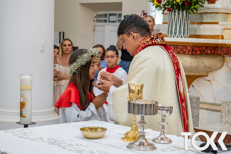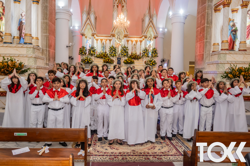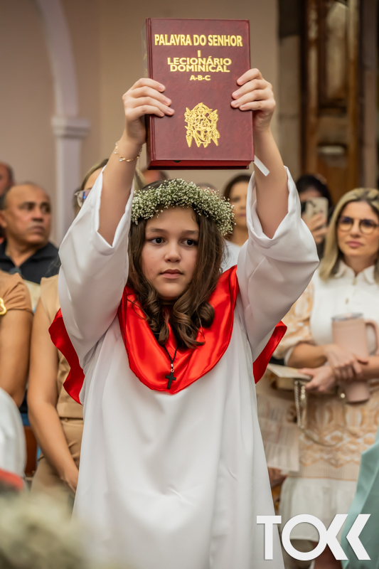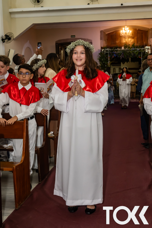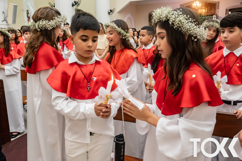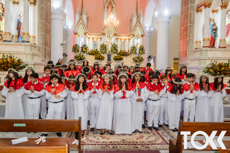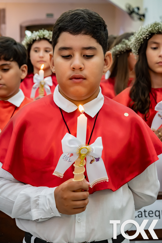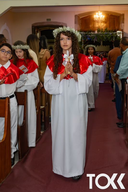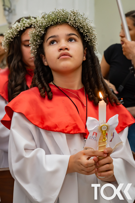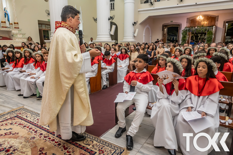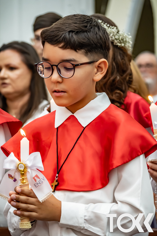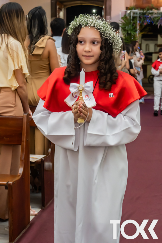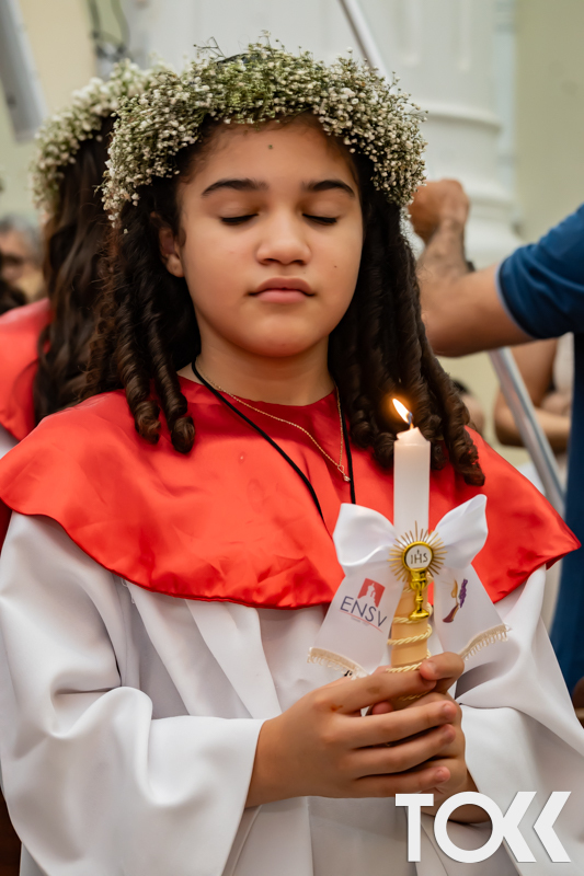 “Neste sábado, dia 22 de novembro de 2025, a Igreja Matriz São João Batista foi palco de uma celebração especial: a primeira eucaristia dos estudantes do Educandário Nossa Senhora das Vitórias(ENSV) . Com alegria e fé, os jovens receberam Jesus pela primeira vez na sagrada comunhão. A cerimônia foi marcada pela presença de familiares, amigos e professores, que acompanharam de perto essa importante etapa na vida espiritual dos estudantes. A missa foi celebrada com música, orações e reflexões que destacaram a importância da fé e do amor de Deus em nossas vidas. Nessa ocasião, os estudantes renovaram suas promessas batismais e receberam a hóstia consagrada, simbolizando a união com Cristo. Foi um momento de grande emoção e gratidão para todos os presentes. Parabéns aos estudantes da escola Educandário Nossa Senhora das Vitórias por essa conquista espiritual! Que essa primeira eucaristia seja o início de uma jornada de fé e amor a Deus.” Fotos para www.tokk.com.br foram cedidas gentilmente por Carlos Eduardo.