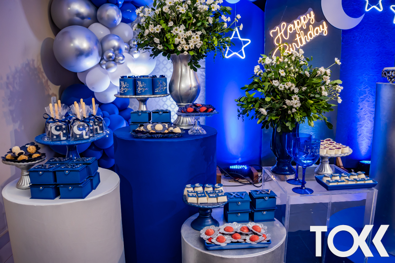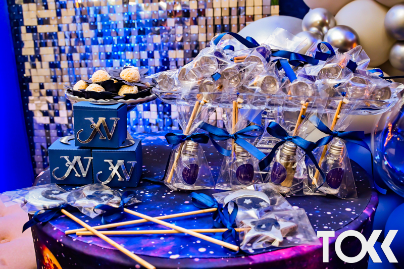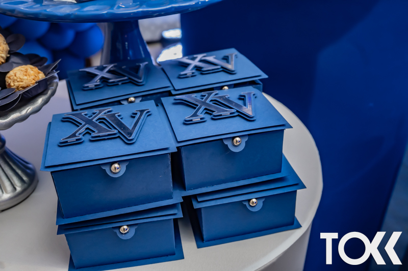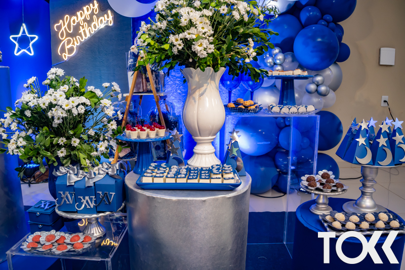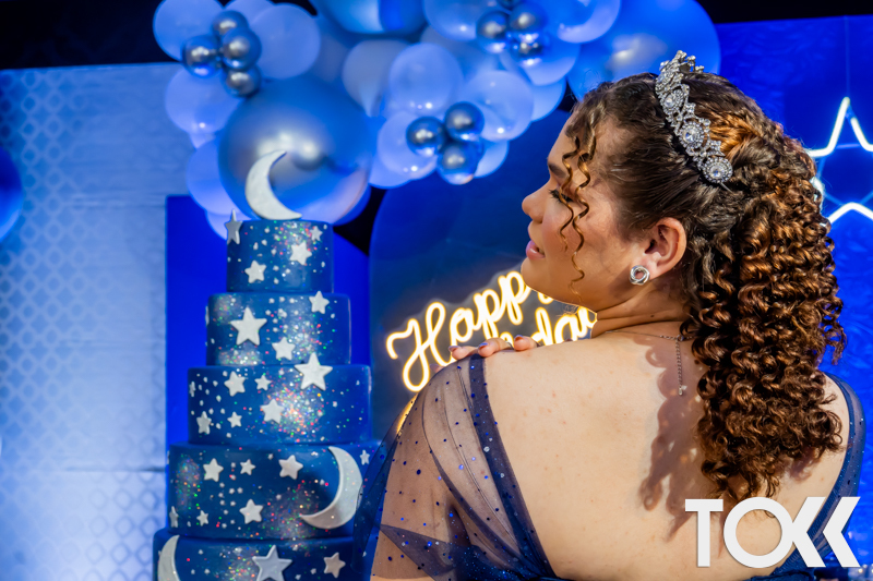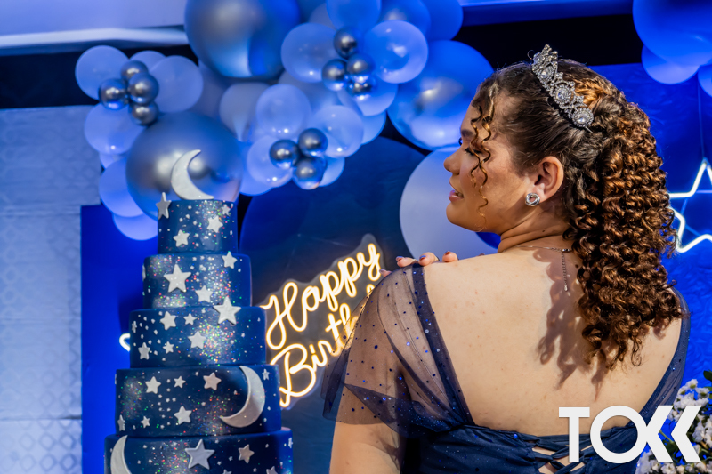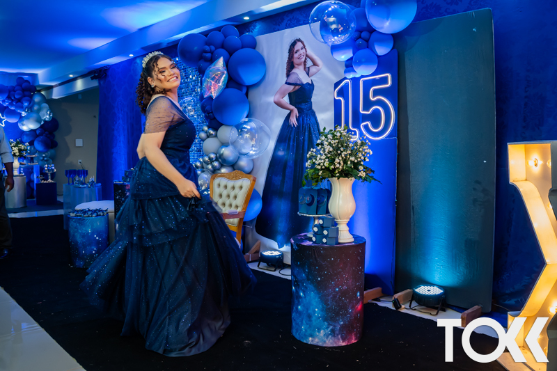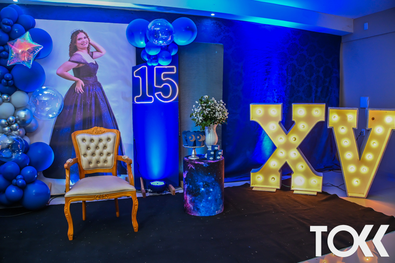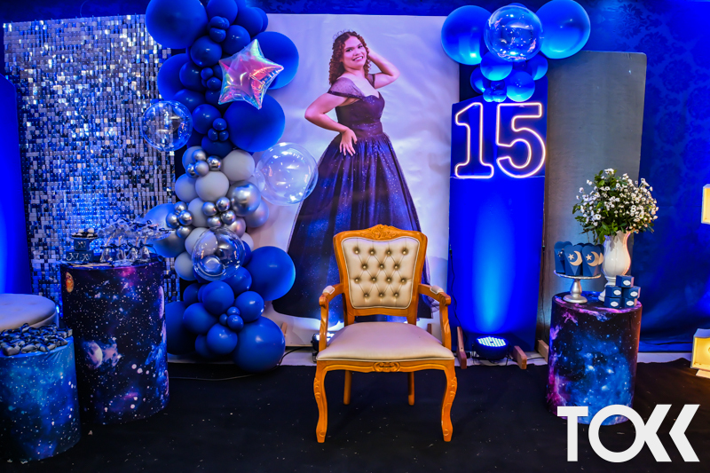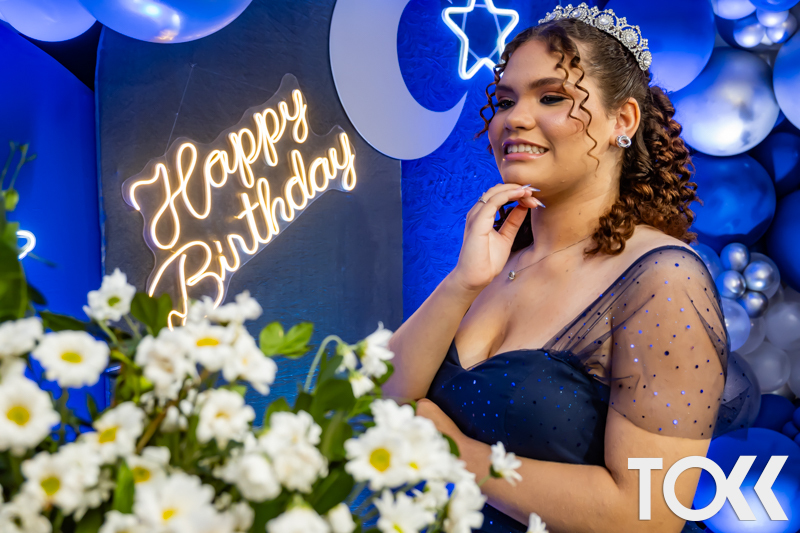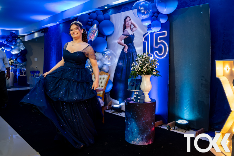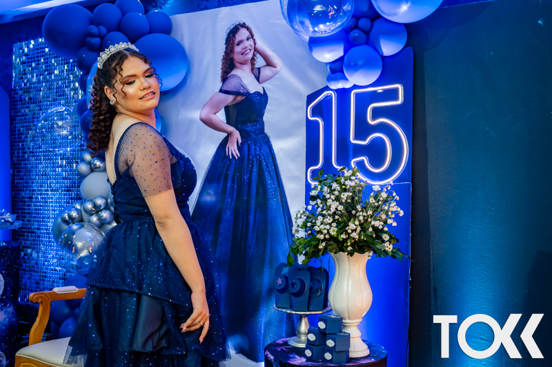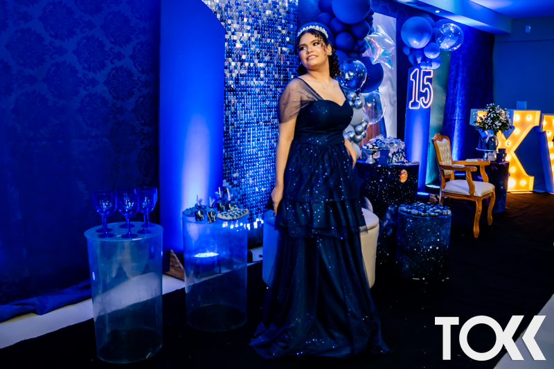 A aniversariante brilhou em um traje assinado por Princess Noivas, e contou com produção de cabelo e maquiagem de Eloisa Oliveira. A iluminação, que destacou cada detalhe do espaço, ficou sob a responsabilidade da RM Iluminações.